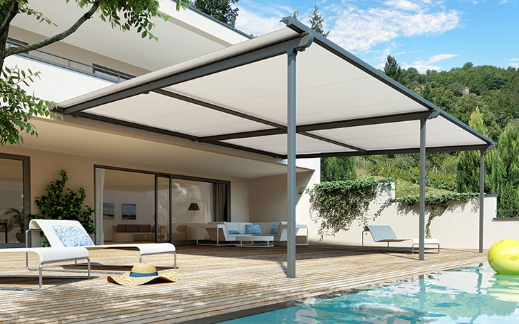Discrète et peu encombrante, la pergola à toile rétractable vous procure de l’ombre avec élégance.